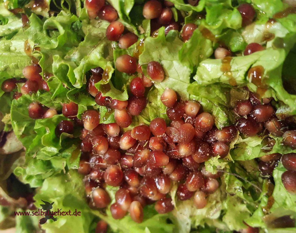 Frisch geerntet: Eichblatt und Batavia! Mit Granatapfelkernen vom Markt und Unkräutersalz.